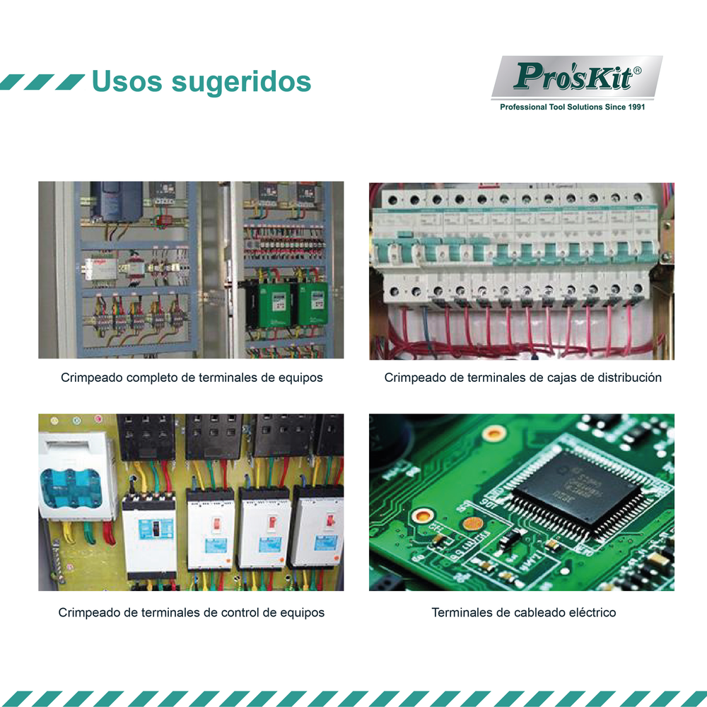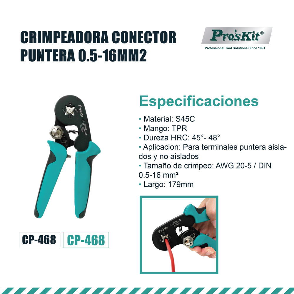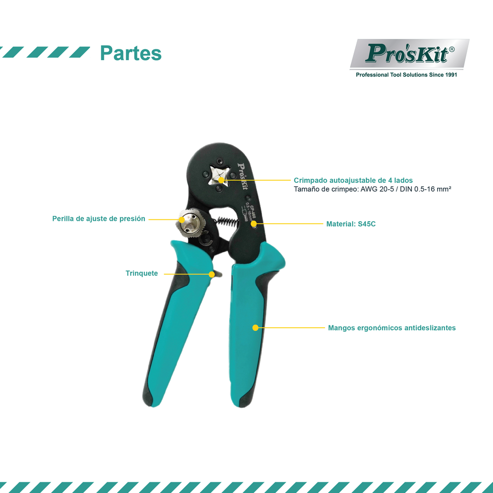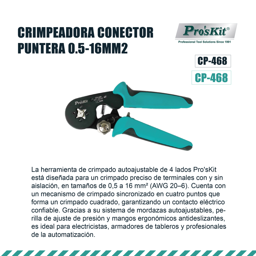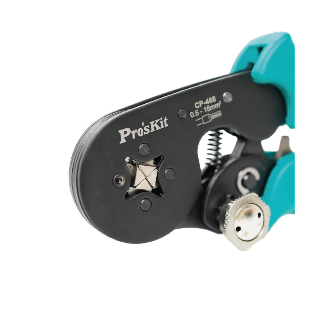 La herramienta de crimpado autoajustable de 4 lados Pro'sKit está diseñada para un crimpado preciso de terminales con y sin aislación, en tamaños de 0,5 a 16 mm² (AWG 20–6). Cuenta con un mecanismo de crimpado sincronizado en cuatro puntos que forma un crimpado cuadrado, garantizando un contacto eléctrico confiable. Gracias a su sistema de mordazas autoajustables, perilla de ajuste de presión y mangos ergonómicos antideslizantes, es ideal para electricistas, armadores de tableros y profesionales de la automatización.